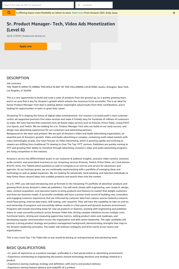 Senior Product Manager Tech Video Ads Monetization Level 6 Job At Amazon In Seattle Wa 54252597 Tapwage Job Search